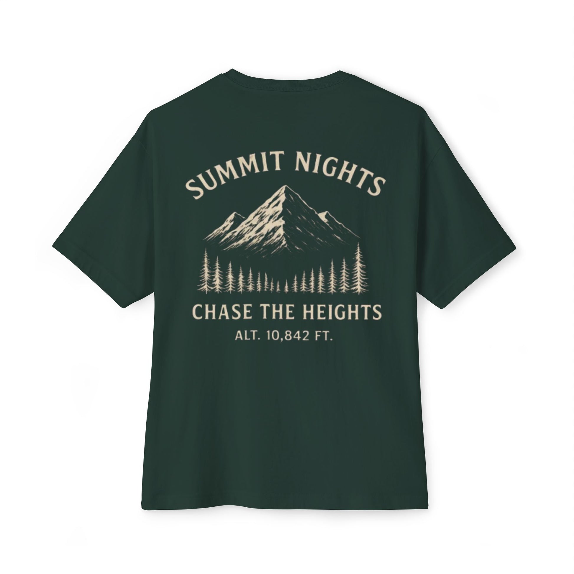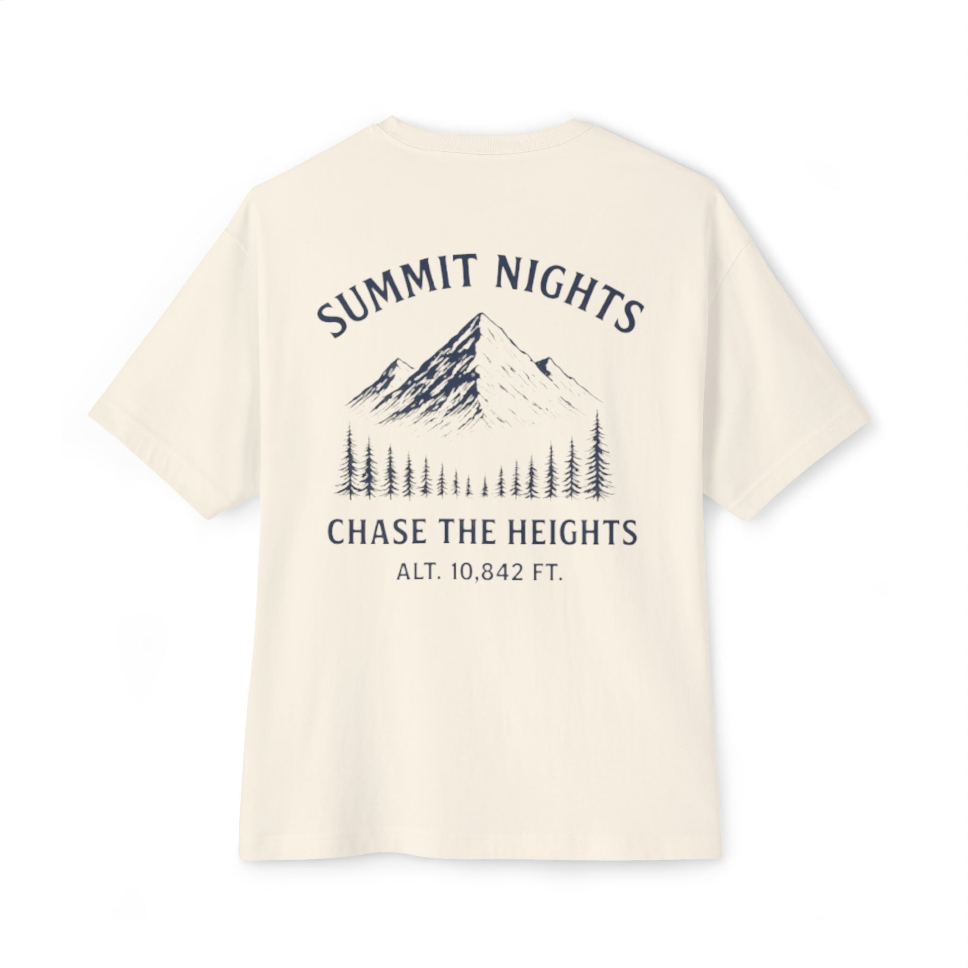 A relaxed, boxy tee that carries the quiet energy of high-country nights. Lightweight but substantial, it drapes with dropped shoulders and a roomy silhouette that invites layering over a flannel or wearing solo on warm dusk hikes. The back print — a sketch of a rugged peak rising above a line of pines, captioned “SUMMIT NIGHTS / CHASE THE HEIGHTS” with elevation detail — feels like a worn memento from a mountain campfire. Small, subtle chest art keeps the front understated while the back tells the story. Wear it on trailheads, at basecamp, or while planning the next ascent; it moves with you and ages into a favorite layer.